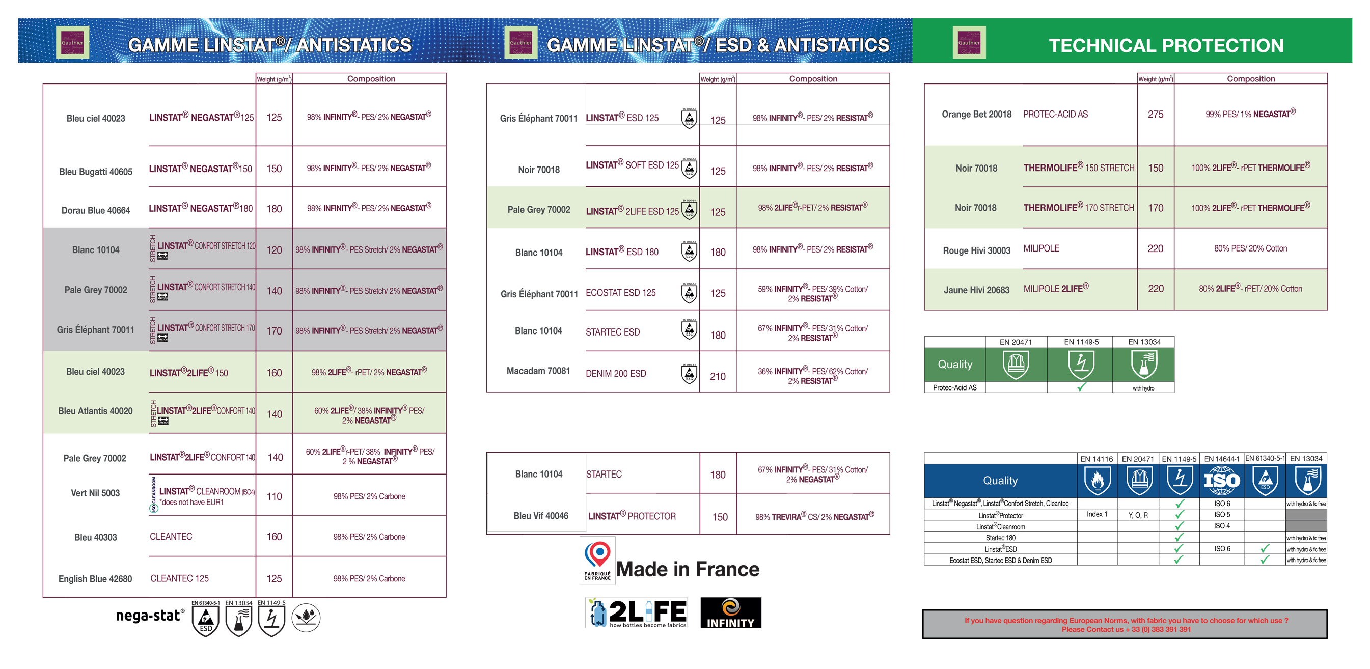 La gamme Linstat® Negastat® est le standard Européen des tissus de protection contre les décharges électrostatiques.
